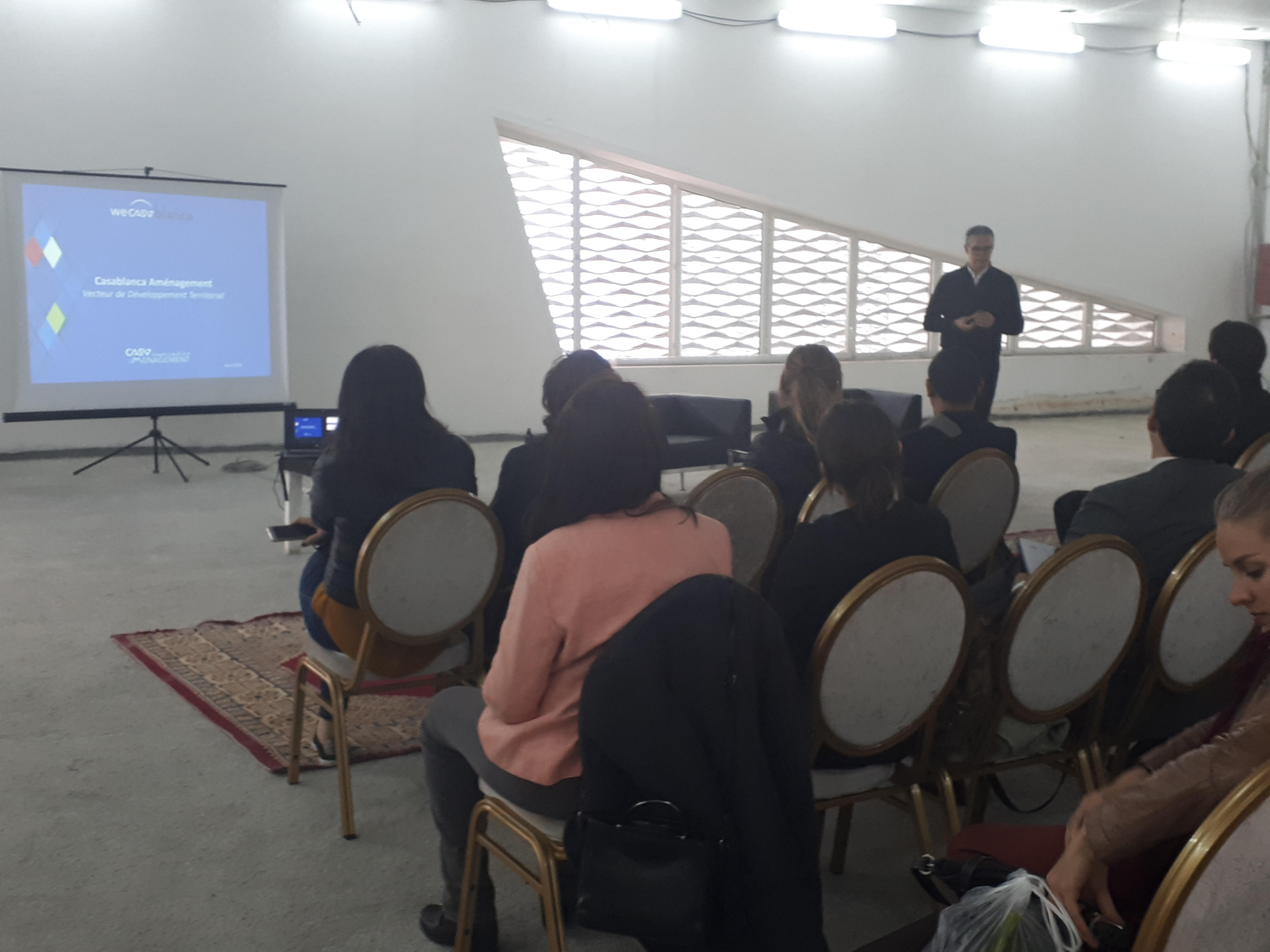 وتضمن اللقاء عرضا مفصلا حول المقاربة التشاركية في إعداد برنامج تنمية مدينة الدار البيضاء الكبرى مع الوقوف على التقدم المحرز في المشاريع المنجزة من طرف الدار البيضاء للتهيئة. تلته زيارة لأوراش المسرح الكبير للدار البيضاء و حديقة الجامعة العربية و مرآب ساحة الراشدي قصد تعزيز الشق النظري للتكوين.